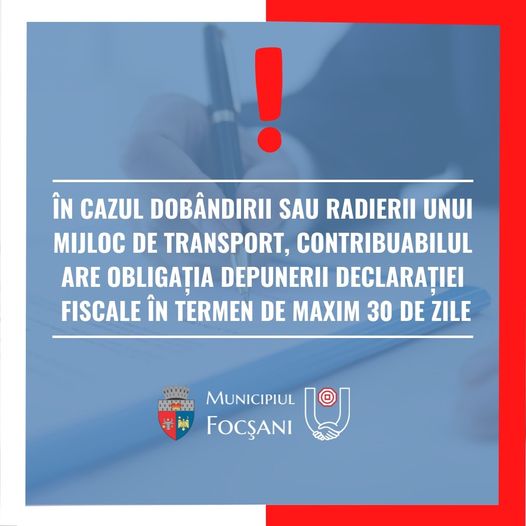Primăria Municipiului Focşani aduce la cunoştinţă persoanelor fizice si juridice că, potrivit prevederilor art. 471 din Legea nr. 227/2015 privind Codul Fiscal, cu modificările și completările ulterioare, „în cazul dobândirii unui mijloc de transport, proprietarul acestuia are obligaţia să depună o declaraţie la organul fiscal local în a cărui rază teritorială de competenţă are domiciliul, sediul sau punctul de lucru, după caz, în termen de 30 de zile de la data dobândirii”, iar “în cazul radierii din circulaţie a unui mijloc de transport sau în cazul oricărei situaţii care conduce la modificarea impozitului pe mijloacele de transport, inclusiv schimbarea domiciliului, sediului sau punctului de lucru, contribuabilul are obligaţia depunerii declaraţiei fiscale cu privire la mijlocul de transport la organul fiscal local pe a cărei rază teritorială îşi are domiciliul/sediul/punctul de lucru, în termen de 30 de zile”.