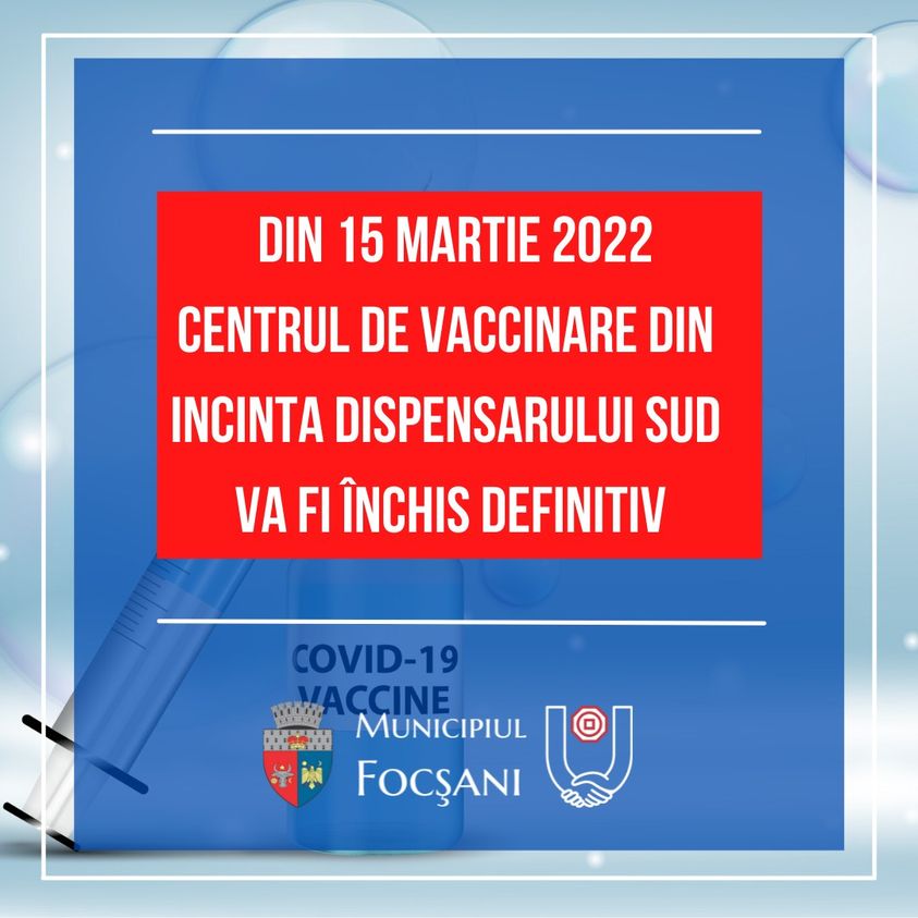 Primăria Municipiului Focșani: Marți 15 martie 2022, Centrul de vaccinare împotriva COVID-19 – Dispensar medical Sud Focșani, se închide definitiv.