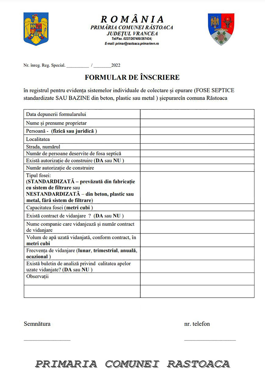?Primăria trebuie să înființeze și să întrețină un registru de evidență a sistemelor individuale adecvate și să pună la dispoziția cetățenilor formularele necesare pentru înregistrarea foselor.