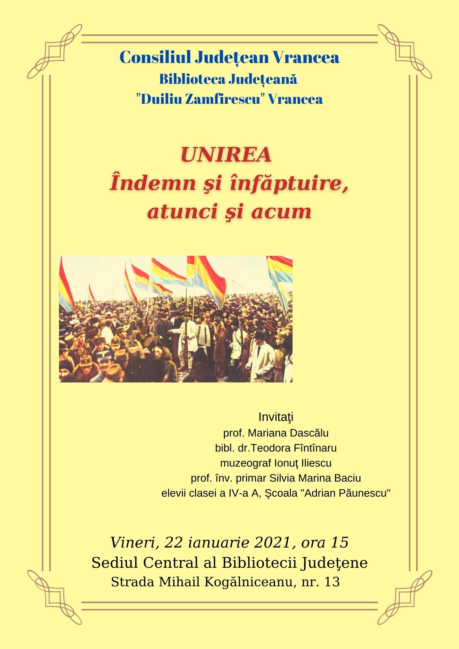 Cu ocazia împlinirii a 162 de ani de la Unirea Principatelor Moldova şi Ţara Românească, Biblioteca Judeţeană „Duiliu Zamfirescu” derulează, vineri, 22 ianuarie 2021, începând cu ora 15, la Sediul Central al Bibliotecii din strada Mihail Kogălniceanu nr. 13, evenimentul cultural UNIREA – Îndemn şi Înfăptuire atunci şi acum.