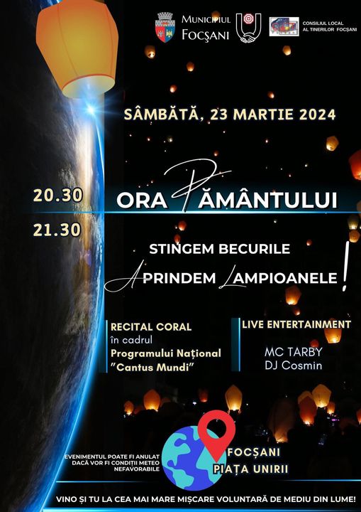 Pe această cale, îi invit pe toți cetățenii Municipiului Focșani să vină în Piața Unirii pentru a marca împreună „Ora Pământului” și să stingă luminile în intervalul 20.30-21.30.