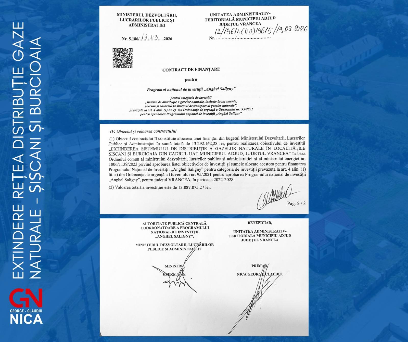 Nica George Claudiu: Am promis că nu lăsăm pe nimeni în urmă — și mă țin de cuvânt: 611 locuințe și 13 utilizatori noncasnici din Burcioaia și Șișcani vor avea, în curând, acces la rețeaua de gaze naturale! Zilele acestea, la Ministerul Dezvoltării, Lucrărilor Publice și Administrației, împreună cu domnul secretar de stat Alexandru Stoica, am semnat contractul de finanțare a extinderii cu 18 km a rețelei de gaze naturale prin Programul Național de Investiții „Anghel Saligny”. Cu alte cuvinte, toate gospodăriile din Șișcani și Burcioaia vor avea montat, la finalul lucrărilor de execuție, branșament la poartă. Mă bucur cu atât mai mult să vă dau această veste, cu cât știu că mulți dintre dumneavoastră așteptați de mult timp acest moment. El este rezultatul unor eforturi susținute și al numeroaselor demersuri pe care le-am întreprins la nivel regional și central pentru a transforma această promisiune a mea față de dumneavoastră – în realitate. Obiectul contractului de finanțare semnat în data de 19 martie 2026 este realizarea obiectivului de investiții ”Extinderea sistemului de distribuție a gazelor naturale în localitățile Șișcani și Burcioaia din cadrul UAT municipiul Adjud, județul Vrancea”. Valoarea totală a investiției este de 13.887.875,27lei. Fac ceea ce am promis și, în același timp, vă asigur că am în vedere și alte obiective de investiții solicitate de dumneavoastră. În prezent, avem mai multe proiecte depuse la autoritățile centrale și regionale, iar noi lucrăm constant pentru ca, pas cu pas, să le putem transforma în realitate.