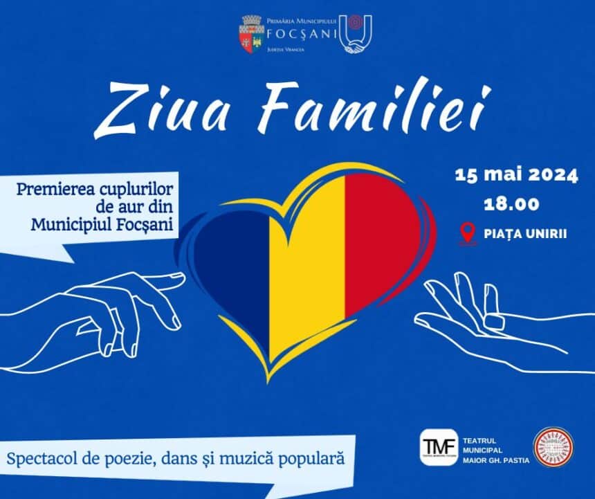 Ziua Internațională a Familiei este sărbătorită în întreaga lume pe data de 15 mai a fiecărui an pentru a sublinia, o dată în plus, importanța familiei. În țara noastră, ziua de 15 mai este și Ziua Familiei Române, prilej pentru noi toți de a marca această instituție a dragostei și fidelității. Cu această ocazie, Primarul Cristi Valentin Misăilă are plăcerea de a premia, într-un cadru festiv, 72 de familii focșănene care aniversează jumătate de secol de iubire neîntreruptă. Evenimentul va avea loc miercuri, 15 mai 2024, în Piața Unirii din Focșani, începând cu ora 18.00 . Cuplurile de “aur” invitate vor primi din partea municipalității câte o diplomă de fidelitate, un tort, un buchet de flori și un premiu în valoare de 500 de lei. Cineva spunea că “dragostea nu are vârstă, fiind mereu în plină tinerețe”. Tocmai de aceea, cele 72 de perechi de “tineri” îndrăgostiți vor avea parte și de un spectacol de poezie, dans și muzică populară, susținut de artiștii de la Teatrul Municipal “Mr. Gh. Pastia” Focșani și Ansamblul Folcloric “Țara Vrancei”, la care sunt invitați să asiste și focșănenii prezenți în Piața Unirii din centrul orașului. Vă așteptăm să sărbătorim împreună IUBIREA!