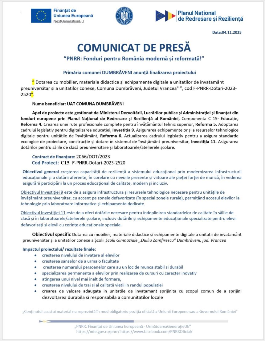 Citești: Primăria comunei Dumbrăveni: ANUNȚ!