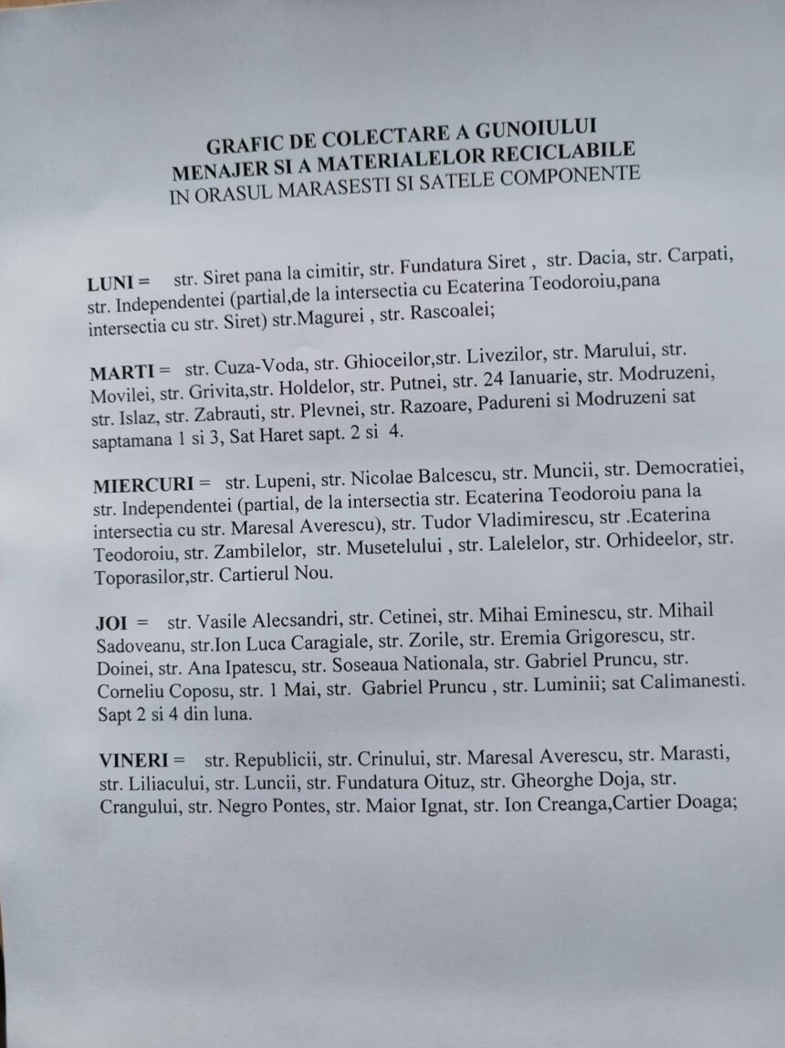Vă informăm că resturile vegetale vor fi ridicate doar în ultima săptămână din fiecare lună, în ziua în care se colectează și gunoiul menajer, conform graficului de ridicare pe străzi prezentat în imaginea atașată. Atenție! Scoaterea și depozitarea la stradă a resturilor vegetale în alte zile decât cele prevăzute în grafic se sancționează conform prevederilor legale, prin aplicarea de sancțiuni. Rugăm cetățenii să respecte întocmai zilele destinate acestei acțiuni, pentru a preveni disconfortul și pentru a menține un aspect curat și civilizat al orașului.