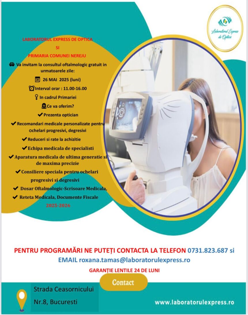 Primăria Comunei Nereju, în parteneriat cu Laboratorul Express de Optică, organizează consult oftalmologic gratuit pentru toți locuitorii comunei, în data de 26 mai 2025 (luni), între orele 11:00 – 16:00, în sediul Primăriei. Pot participa, de asemenea, atât copiii peste 14 ani, doar însoțiți de un adult. Pentru o bună organizare, rugăm persoanele interesate să confirme participarea.