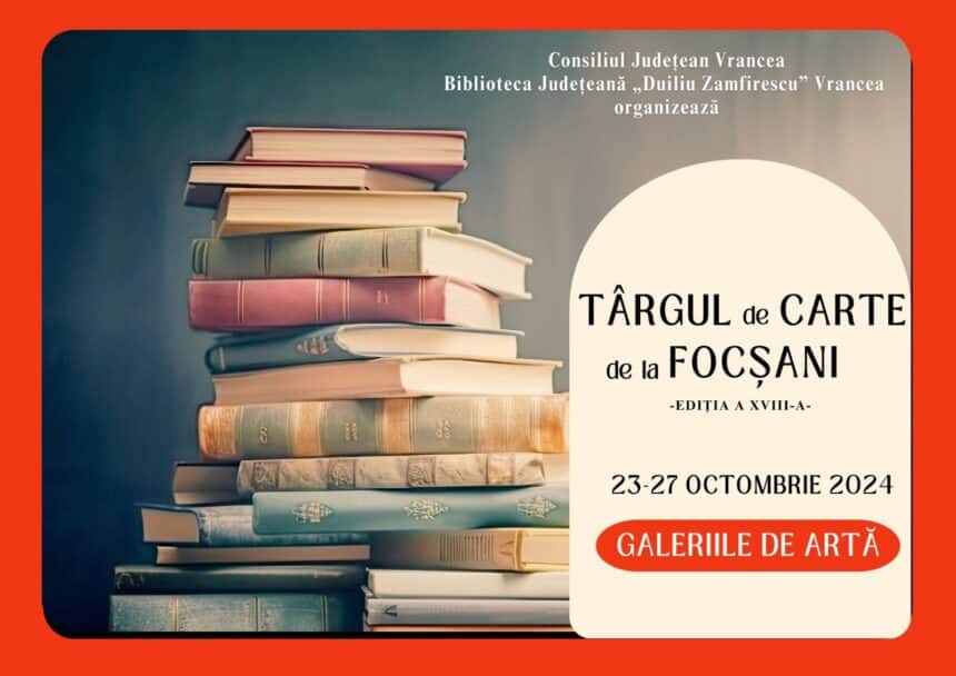 Consiliul Județean Vrancea, prin Biblioteca Judeţeană „Duiliu Zamfirescu” Vrancea, organizează în perioada 23 – 27 octombrie 2024, a XVIII-a ediţie a Târgului de Carte de la Focşani, la Galeriile de Artă din Focșani.