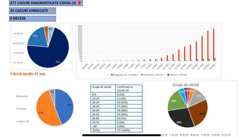 Grupul de Comunicare Strategică anunță că până ieri, 19 martie, pe teritoriul României, au fost confirmate 277 de cazuri de persoane infectate cu virusul COVID – 19 (coronavirus). Dintre cele 277 de persoane confirmate pozitiv, 25 au fost declarate vindecate și externate ( 16 la Timișoara, 8 la București și unul la Iași).