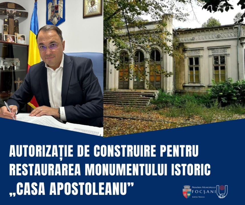 Am semnat autorizația de construire pentru proiectul de consolidare și restaurare a monumentului istoric Casa Apostoleanu, de pe strada Cuza Vodă.