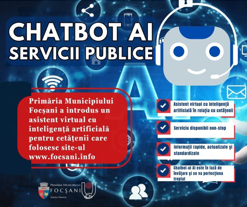 Primăria Municipiului Focşani îmbunătăţeşte serviciile electronice oferite cetăţenilor prin implementarea unui Chatbot AI pe site-ul administraţiei locale. O soluţie prin care folosim inteligența artificială pentru a îmbunătăți și eficientiza serviciile oferite cetățenilor Municipiului Focșani care accesează pagina de internet a municipalității pentru a obține informaţii publice.