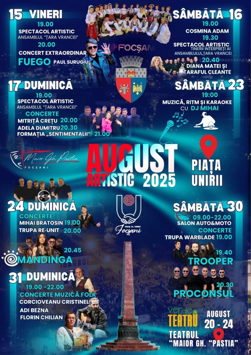 Primăria Municipiului Focșani, prin Teatrul „Maior Gh. Pastia”, vă invită în luna august la o serie de evenimente cultural-artistice sub egida „August Artistic”.
