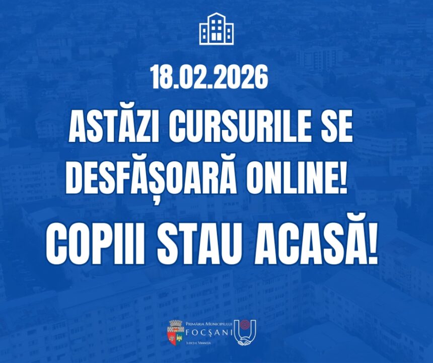 Cursuri online astăzi! Având în vedere condițiile meteorologice severe generate de ninsorile abundente, viscolul puternic și avertizarea meteorologică Cod portocaliu aflată în vigoare pentru județul Vrancea, în urma analizelor realizate în cadrul Comitetului Județean pentru Situații de Urgență s-a dispus suspendarea cursurilor cu prezență fizică în toate unitățile de învățământ din județul Vrancea, pentru data de 18 februarie 2026, activitățile didactice urmând a se desfășura în sistem online!