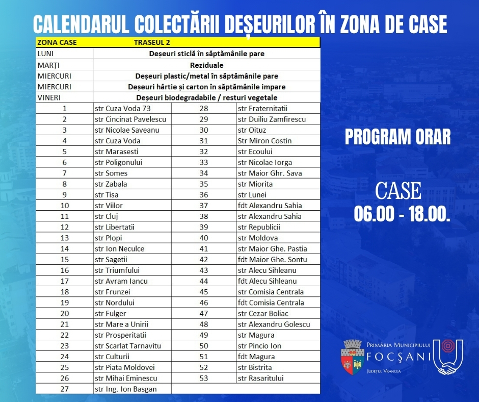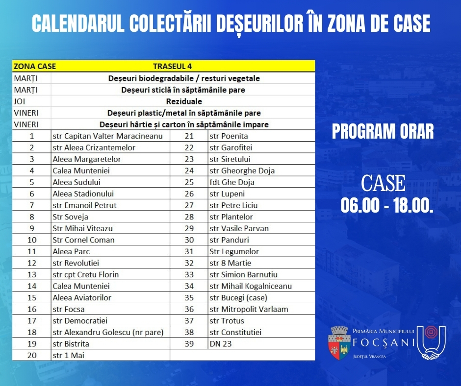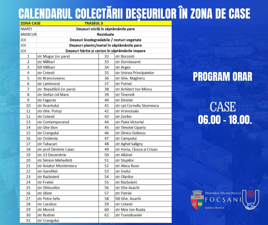 Pentru sesizări sau neclarități referitoare la activitatea de colectare a deșeurilor puteți folosi numerele de telefon de 0337401170 / 0747090412 – ADI „Vrancea Curată”, respectiv 0775389740 – SC Polaris M Holding SRL din Constanța.
