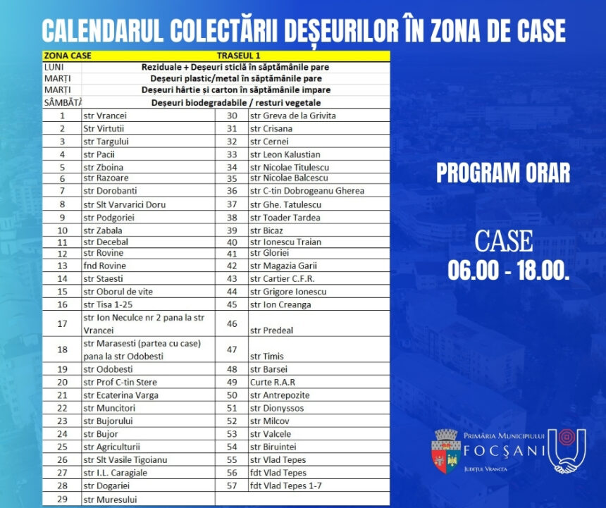 Pentru sesizări sau neclarități referitoare la activitatea de colectare a deșeurilor puteți folosi numerele de telefon de 0337401170 / 0747090412 – ADI „Vrancea Curată”, respectiv 0775389740 – SC Polaris M Holding SRL din Constanța.
