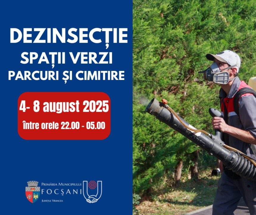 Angajații DDSP Focșani vor efectua dezinsecția în perioada 04 – 08 august 2025, în intervalul orar 22:00 – 05:00, pe domeniul public – suprafețele parcurilor, spațiilor verzi și cimitirelor din oraș, în funcție de condițiile meteorologice.