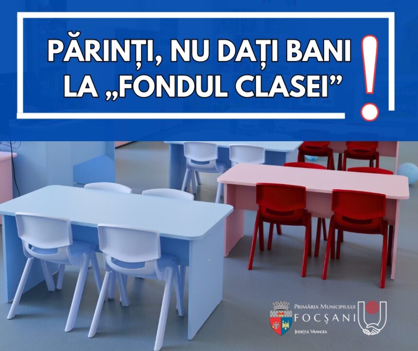 Ca urmare a unor sesizări primite de la cetățeni în primele zile ale noului an școlar, le reamintesc părinților și cadrelor didactice din Municipiul Focșani că este interzisă colectarea de bani pentru fondul clasei sau fondul școlii.
