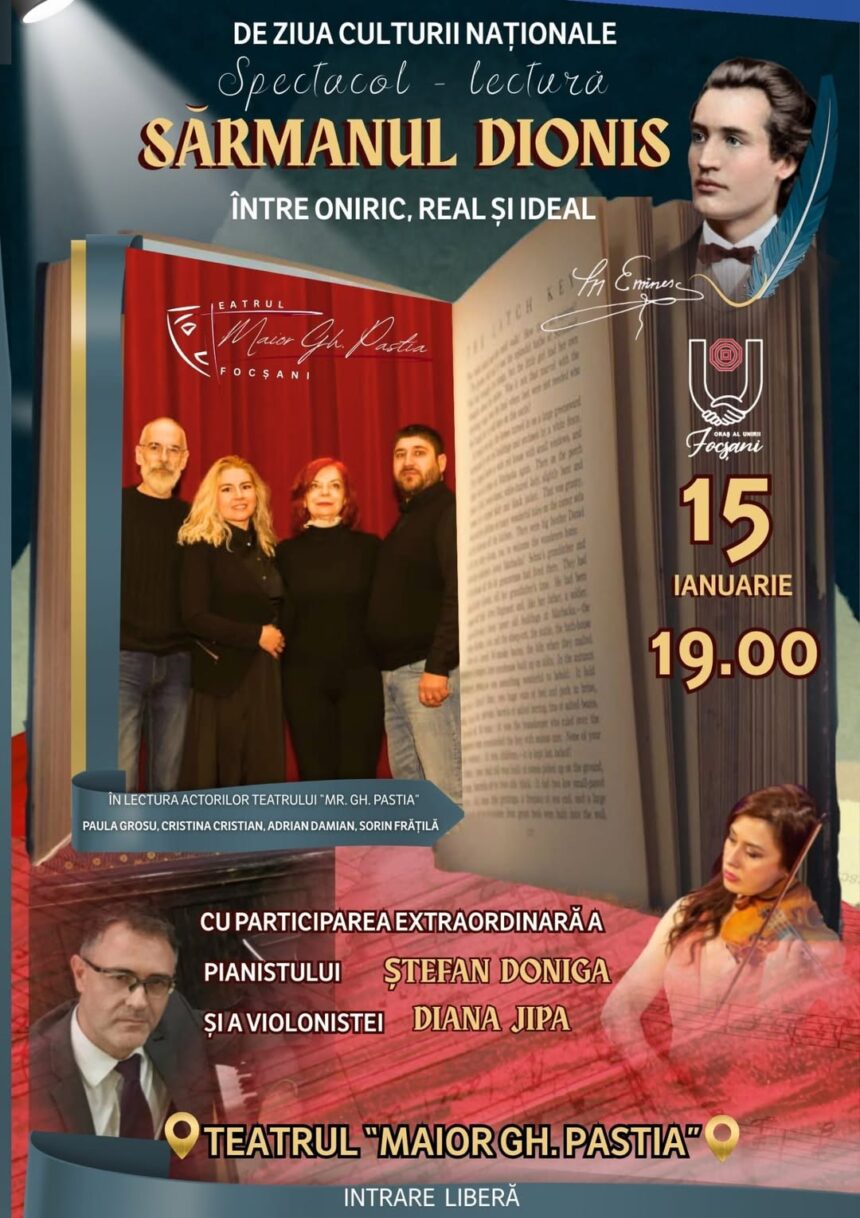 Primăria Municipiului Focşani, prin Teatrul ”Maior Gh. Pastia”, vă invită la premiera spectacolului lectură “Sărmanul Dionis – între oniric, real și ideal”, dedicat poetului național Mihai Eminescu.