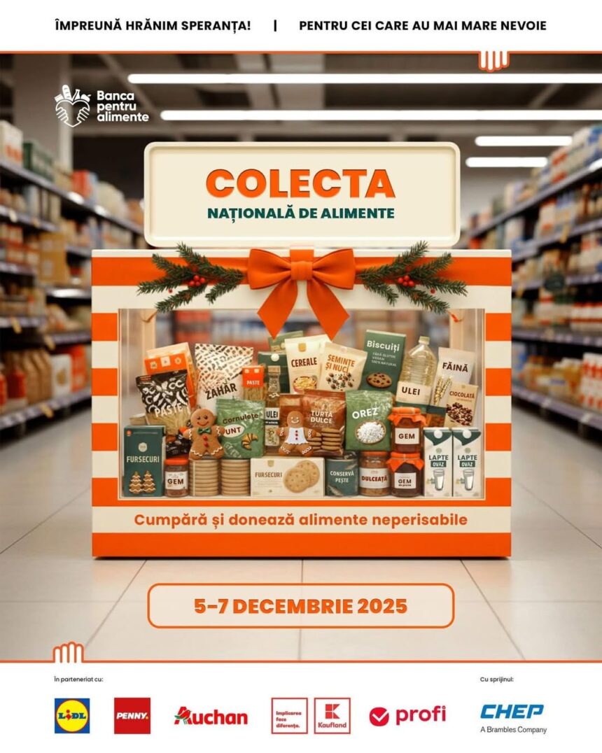 În perioada 5 – 7 decembrie 2025 participăm la Campania Națională de Alimente organizată de rețeaua Băncilor pentru Alimente din România.