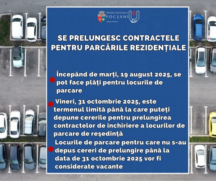 Cererile pentru închirierea unui loc de parcare pentru anul următor pot fi realizate online sau la sediul Compartimentului Parcări din cadrul DDSP Focșani până cel târziu pe 15 noiembrie 2025.