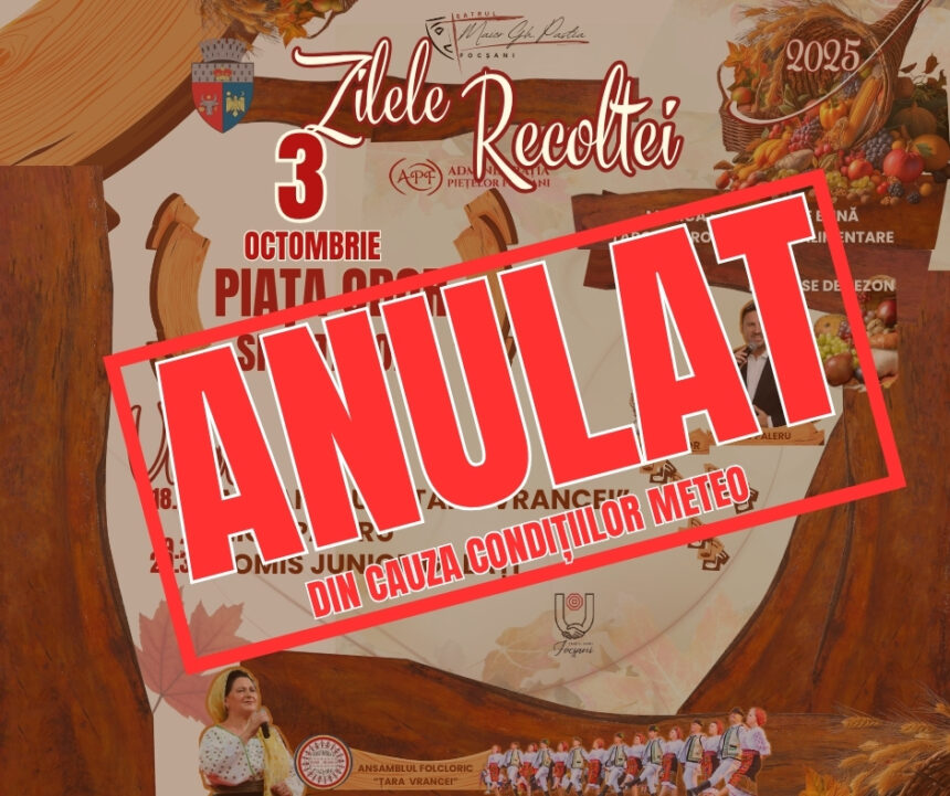 Spectacolul din cadrul evenimentului „Zilele Recoltei” programat pentru această seară, vineri, 3 octombrie va fi anulat din cauza condiţiilor meteo. Astăzi, Municipiul Focșani este sub cod galben de vânt și precipitații.