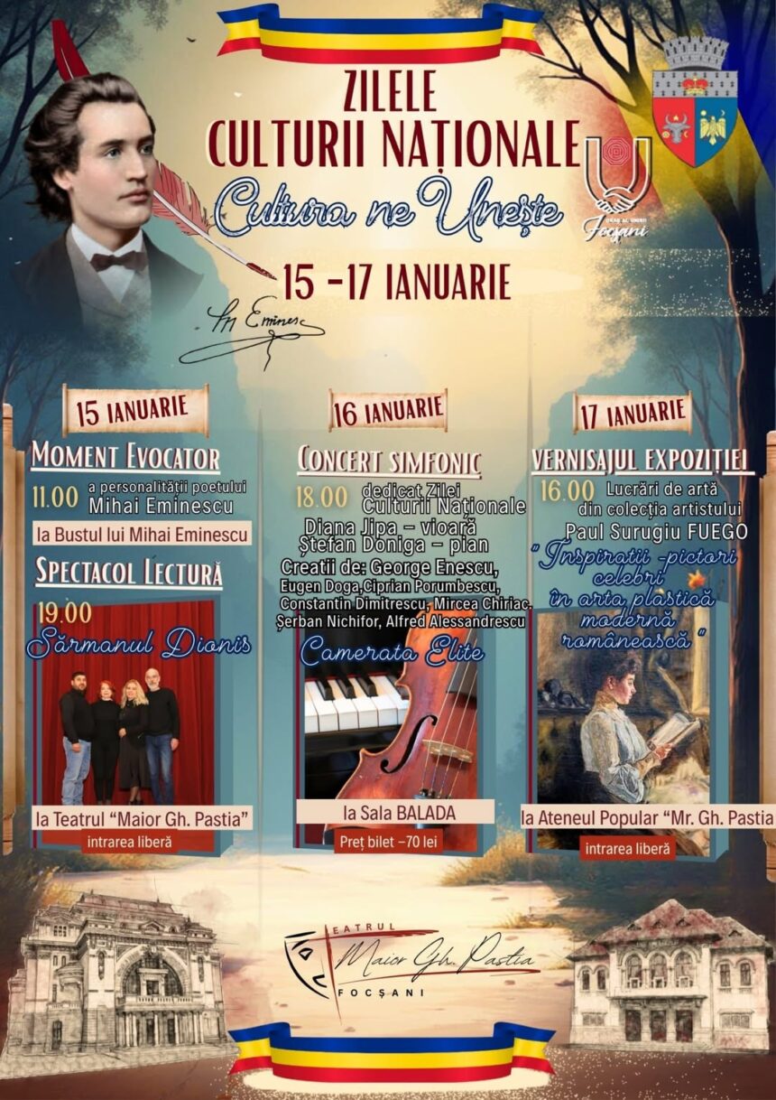 Primăria Municipiului Focşani, prin Teatrul ”Maior Gh. Pastia” organizează un adevărat maraton cultural menit să marcheze 176 ani de la naşterea poetului Mihai Eminescu.