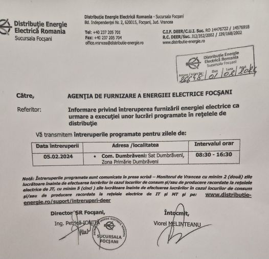 Informare privind întreruperea furnizării energiei electrice ca urmare a execuției unor lucrări programate în rețelele de distribuție