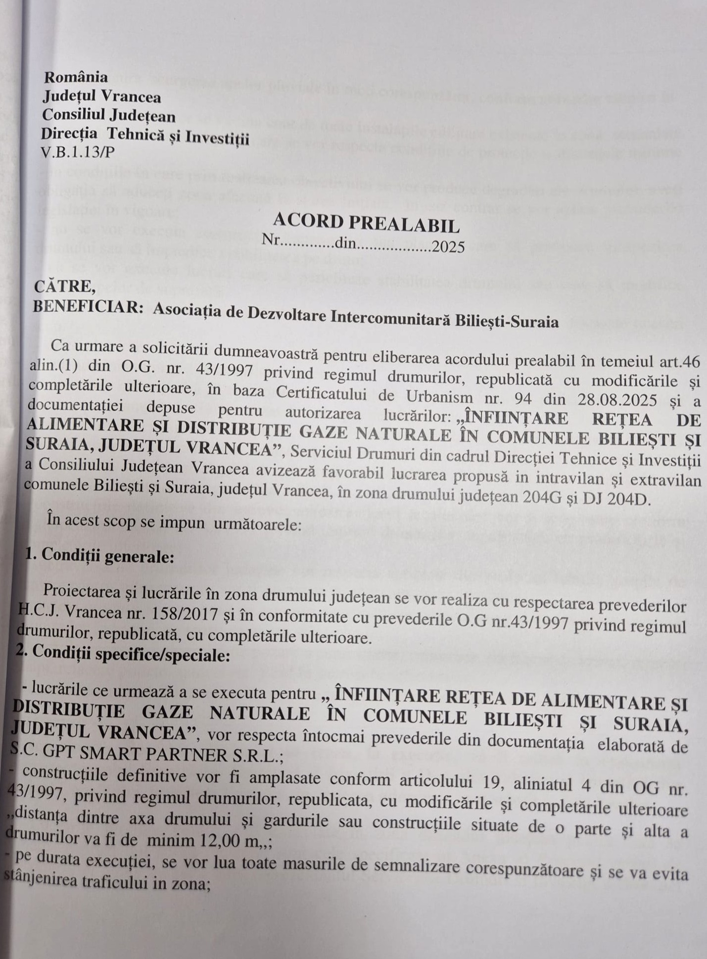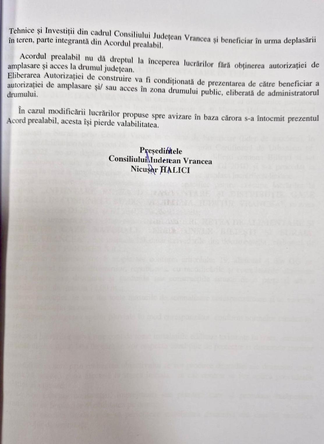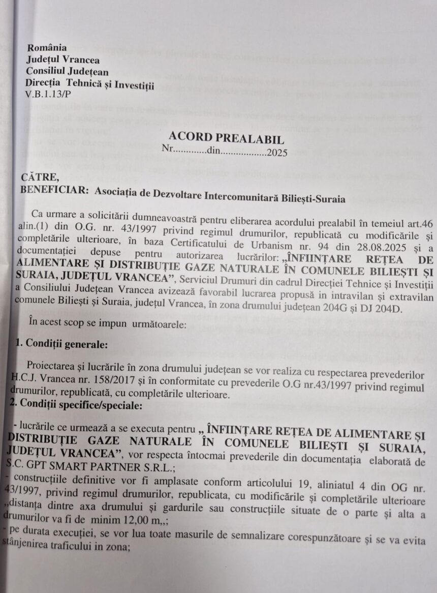Președintele Consiliului Județean Vrancea, Nicușor Halici, a semnat autorizația de amplasare și execuție lucrări în zona drumurilor județene 204G și 204D și acordul prealabil pentru realizarea proiectului ”Înființare rețea de alimentare și dsitribuție gaze naturale în comunele Biliești și Suraia, județul Vrancea”, beneficiar Asociația de Dezvoltare Intercomunitară Biliești – Suraia.