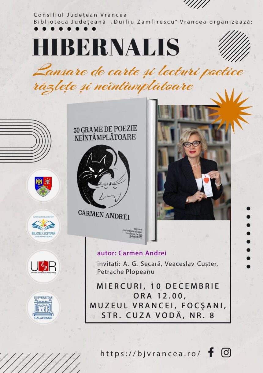Consiliul Județean Vrancea, prin Biblioteca Județeană „Duiliu Zamfirescu” Vrancea, organizează evenimentul intitulat „Hibernalis – Lansare de carte și lecturi poetice răzlețe și neîntâmplătoare”, autor Carmen Andrei, la Muzeul Vrancei din str. Cuza Vodă nr. 8, miercuri, 10 decembrie, ora 12.00.