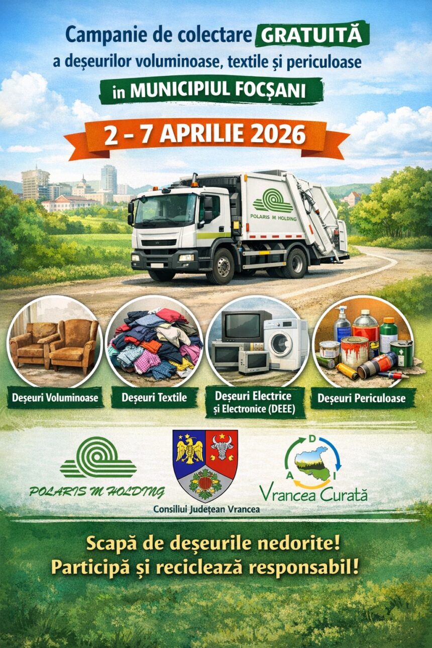În perioada 2 – 7 aprilie 2026, în municipiul #Focșani organizăm o amplă campanie de colectare gratuită a deșeurilor care nu pot fi depozitate în mod obișnuit: voluminoase, textile, electrice și electronice (DEEE), precum și deșeuri periculoase din gospodării.