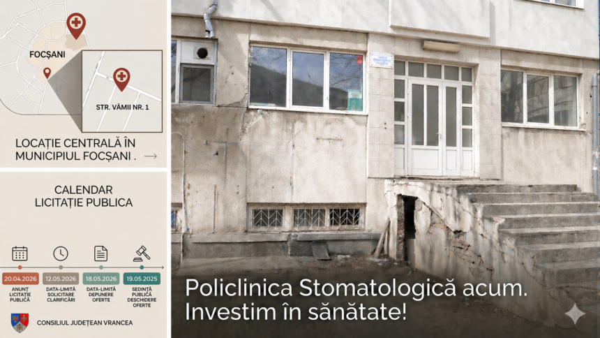 Consiliul Județean Vrancea face un pas concret pentru revitalizarea infrastructurii medicale din județ, lansând procedura de licitație publică pentru închirierea imobilului cunoscut drept „Policlinica Stomatologică”, situat în municipiul Focșani, strada Vămii nr. 1.