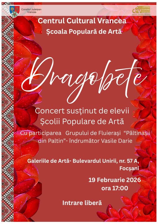 19 februarie 2026, la ora 17:00, sub semnul lui 𝘋𝘳𝘢𝘨𝘰𝘣𝘦𝘵𝘦. Nu este doar o sărbătoare a iubirii, ci și una a tinereții. Elevii Școlii Populare de Artă vor urca pe scenă pentru un concert special, acompaniați de sunetul arhaic al Grupului de Fluierași „Păltinașii din Paltin”, sub îndrumarea lui Vasile Darie. Este ocazia perfectă să simți pulsul tradiției autentice vrâncene. Intrarea va fi liberă.