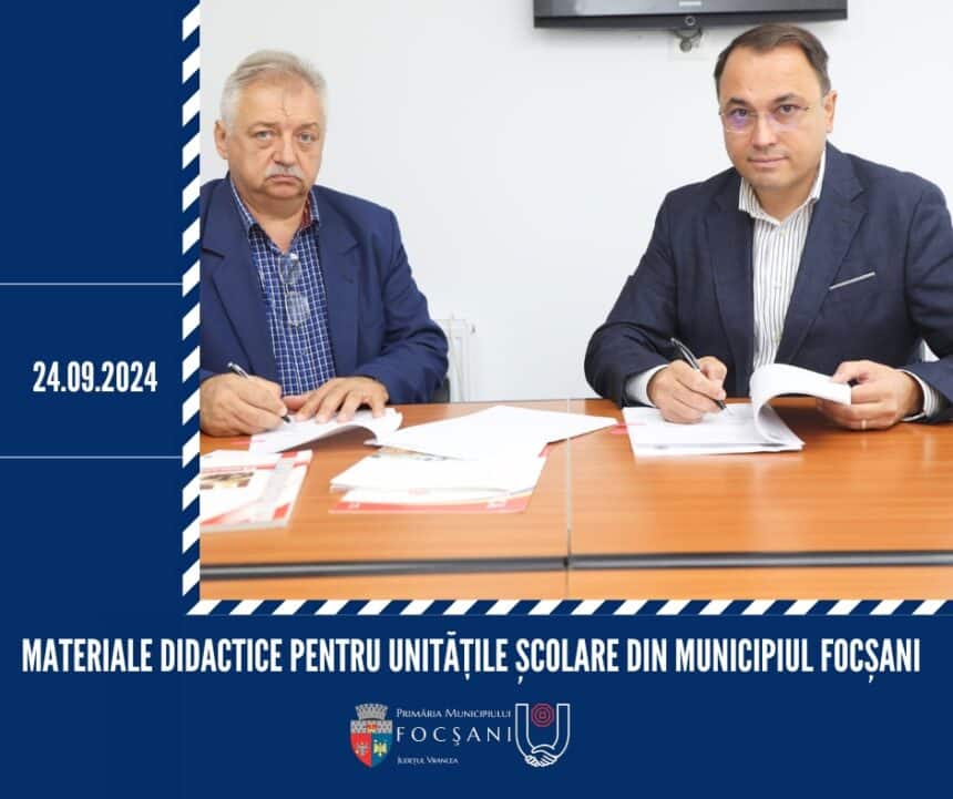 Cu bani europeni dotăm cu materiale și echipamente didactice unitățile școlare din Municipiul Focșani. Primarul Cristi Valentin Misăilă a semnat, astăzi, 24 septembrie 2024, contractul pentru furnizarea materialelor didactice care vor fi achiziționate în cadrul proiectului „Dotarea cu mobilier, materiale didactice și echipamente digitale a unităților de învățământ din Municipiul Focșani” finanțat prin Planul Național de Redresare și Reziliență (PNRR), componenta C:15 Educație. Pe lista materialelor care urmează să fie livrate în următoarele luni se află module de mecanică, optică, truse pentru experimente de chimie, microscoape, colecții de minerale, roci, soluri, globuri, hărți, planșe didactice tematice, pianine, jocuri pentru dezvoltarea psihomotricității, jocuri de orientare în spațiu, mulaje, etc. Lista dotărilor a fost realizată în urma solicitărilor realizate de către fiecare unitate școlară, cu avizul Inspectoratului Școlar Județean Vrancea. Proiectul finanțat prin PNRR asigură cele mai bune condiții pentru elevii dar și cadrele didactice de la unitățile de învățământ din Municipiul Focșani. În cadrul proiectului a fost achiziționat mobilier școlar și materiale didactice pentru 345 săli de la clasă de la unitățile de învățământ dar și echipamentele și mobilierul necesar pentru echiparea a trei ateliere de practică la Colegiul Tehnic „Gheorghe Asachi”, Colegiul Tehnic “Ion Mincu”, Colegiul Tehnic „Edmond Nicolau”. Tot în cadrul proiectului finanțat prin PNRR asigurăm dotarea unităților școlare din Municipiul Focșani cu echipamente digitale pentru 422 săli de clasă și 25 laboratoare de informatică dar și materiale și echipamente sportive noi pentru 16 săli de sport de la școli și licee.