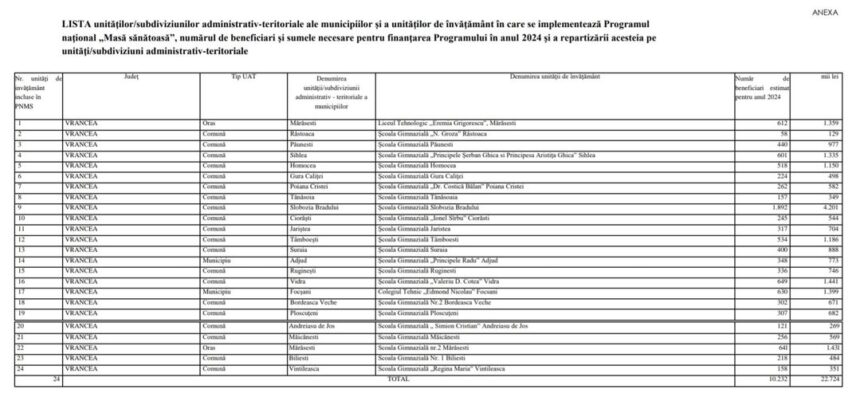 Suntem bucuroși să anunțăm că mai multe școli din județul Vrancea vor beneficia de finanțare guvernamentală pentru implementarea programului „Masă Sănătoasă”.