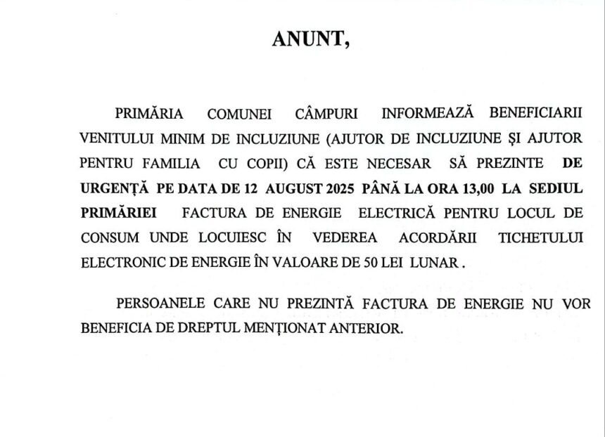 AdministrativStiri Vrancea Primăria Câmpuri: ANUNȚ IMPORTANT 12 august 2025 DISTRIBUIE Primăria comunei Câmpuri Știri despre: primaria campuri, stiri de focsani, stiri de ultima ora vrancea, stiri din vrancea, stiri vrancea, stiri vrancea azi Vrancenii 12 august 2025 12 august 2025 Articolul anterior Sorin Vulcan: INVITAȚIE! Articolul următor Cristi Misăilă: Servicii AI oferite de Primăria Municipiului Focșani în relația cu cetățenii Urmărește-ne pe Facebook Ultimele știri din Vrancea Cristi Misăilă: am avut bucuria de a o primi la Primăria Focșani pe marea noastră campioană Gina Gogean Administrativ Stiri Vrancea Cristi Misăilă: Decembrie de poveste la Focșani unde întâmpinăm magia Crăciunului printr-o serie de concerte de colinde și de obiceiuri tradiționale românești Administrativ Stiri Vrancea Primăria Vârteșcoiu: O nouă oportunitate pentru tinerii din mediul rural: Programul [N]GO RURAL Administrativ Stiri Vrancea Cristi Misăilă: să donăm la Colecta Națională de Alimente care are loc în acest sfârșit de săptămână Administrativ Stiri Vrancea Conferință – Academician Prof. Dr. Alexandru Vlad Ciurea Stiri Vrancea Cristi Misăilă: Program Weekend 04 – 07 DECEMBRIE 2025 Administrativ Stiri Vrancea Nicușor Halici: APEL PUBLIC CĂTRE GUVERNUL ROMÂNIEI! Stiri Vrancea Nicușor Halici: APEL PUBLIC CĂTRE GUVERNUL ROMÂNIEI! Stiri Vrancea
