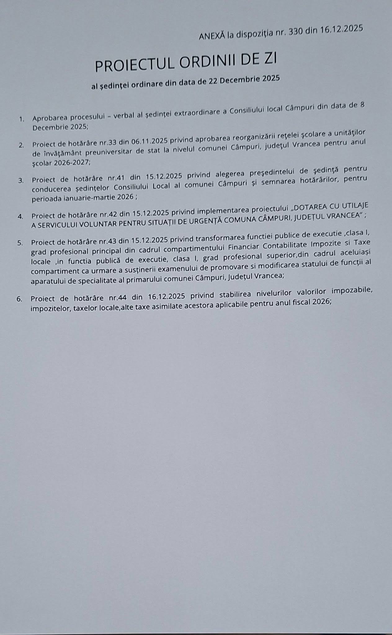 Stimați cetățeni,vă informăm că în data de 22.12.2025, ora 13:00 va avea loc ședința de consiliu local unde vor fi dezbătute proiectele ordinii de zi care se regăsesc în documentele atașate. Ședința se va desfășura în sala de ședința a Consiliului Local Câmpuri.