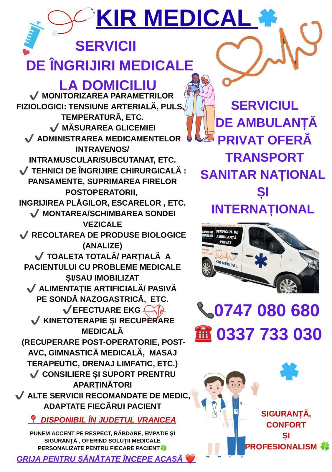 Fie că este vorba despre monitorizarea stării de sănătate, tratamente, recuperare medicală sau transport sanitar privat, o echipă de specialiști este pregătită să ofere servicii sigure, rapide și personalizate.