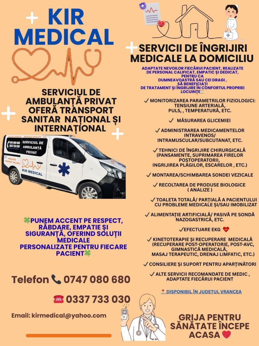 Fie că este vorba despre monitorizarea stării de sănătate, tratamente, recuperare medicală sau transport sanitar privat, o echipă de specialiști este pregătită să ofere servicii sigure, rapide și personalizate.