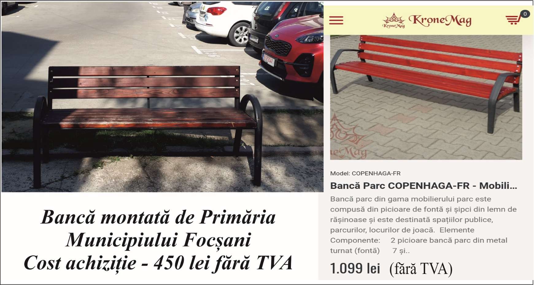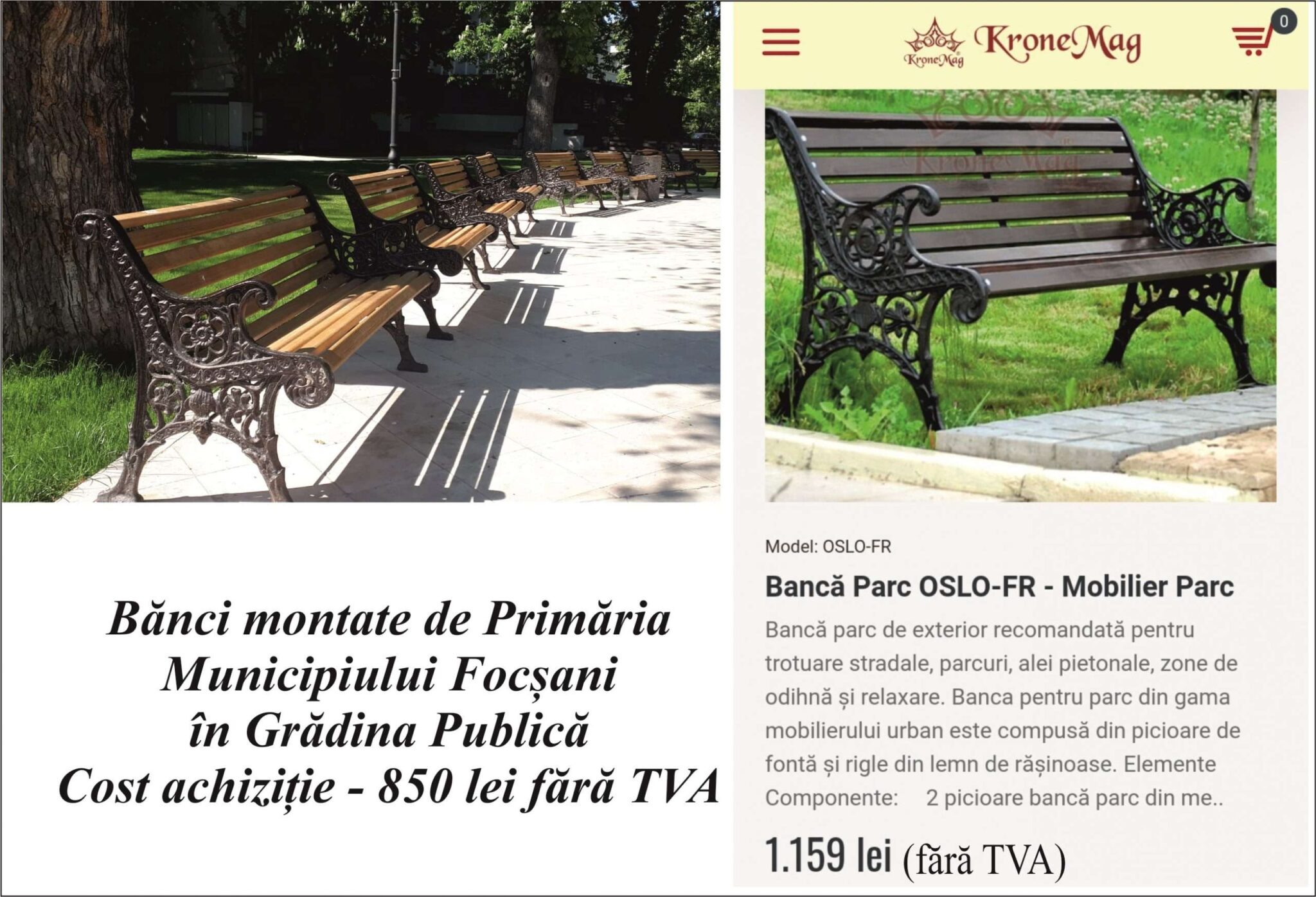 În aceste condiții, se poate observa că Primăria Municipiului Focșani, prin Direcția de Dezvoltare Servicii Publice, nu cumpără bănci la prețuri duble, ci dimpotrivă le achiziționează la prețuri sub cele existente pe piață. Drept dovadă stau fotografiile atașate, unde se poate vedea clar care sunt prețurile de pe piață și cu cât a achiziționat de fapt municipalitatea aceleași modele de bănci. Iar focșănenii să tragă singuri concluziile.