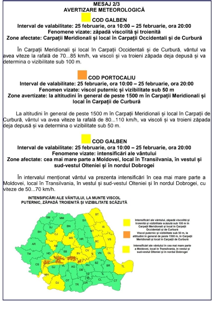 AVERTIZARE METEOROLOGICĂ ANM: Ninsori, Viscol și Vânt Puternic Administrația Națională de Meteorologie a emis o serie de atenționări și avertizări de vreme rea, valabile începând de astăzi, 25 februarie 2026.