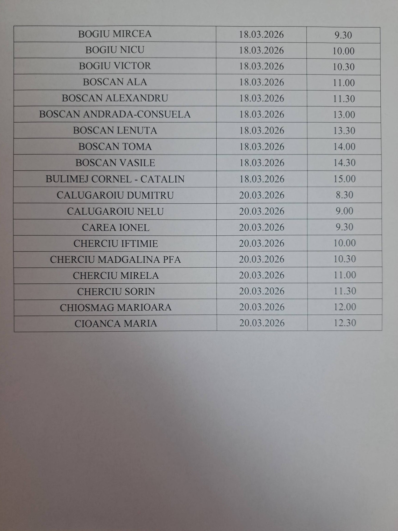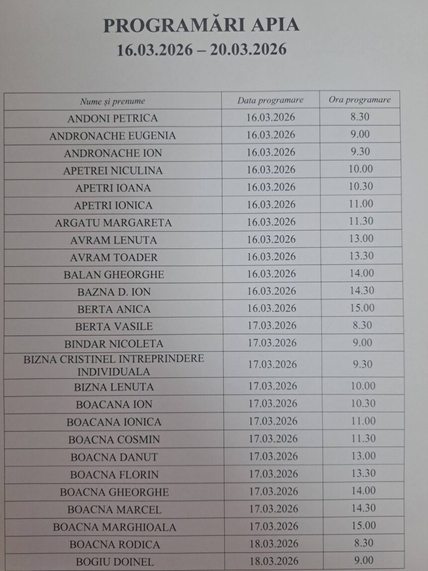 Vă rugăm să consultați lista programărilor pentru perioada 16.03.2026-20.03.2026 și să fiți prezenți la sediul CL APIA Vidra la data și ora stabilită!