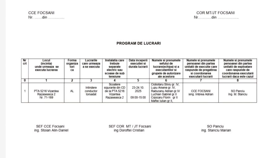 Vă informăm că în data de 23.10.2025 și 24.10.2025, în intervalul orar 09:00- 15:00, va fi întreruptă furnizarea energiei electrice în satul Vizantea-Răzășeasca, pentru efectuarea unor lucrări de utilitate publică (întindere conductor torsadat).
