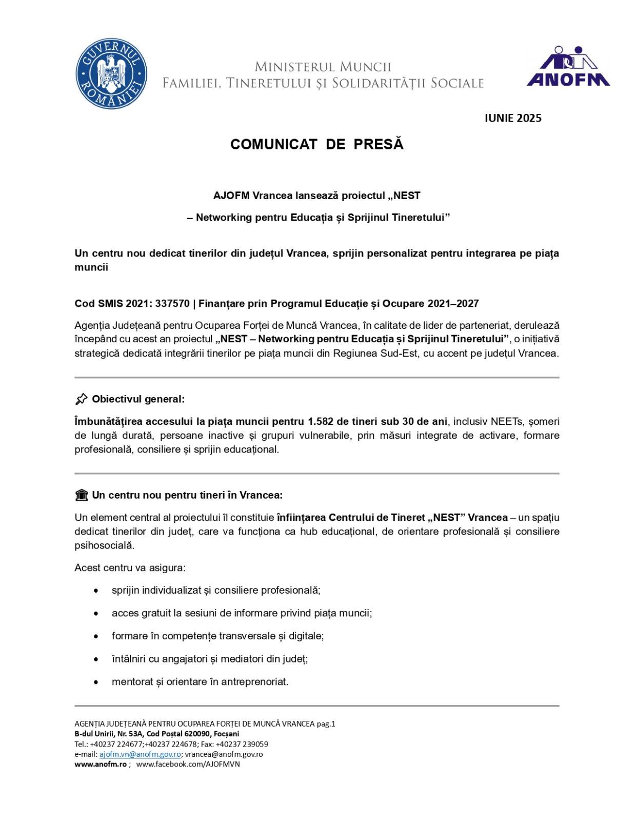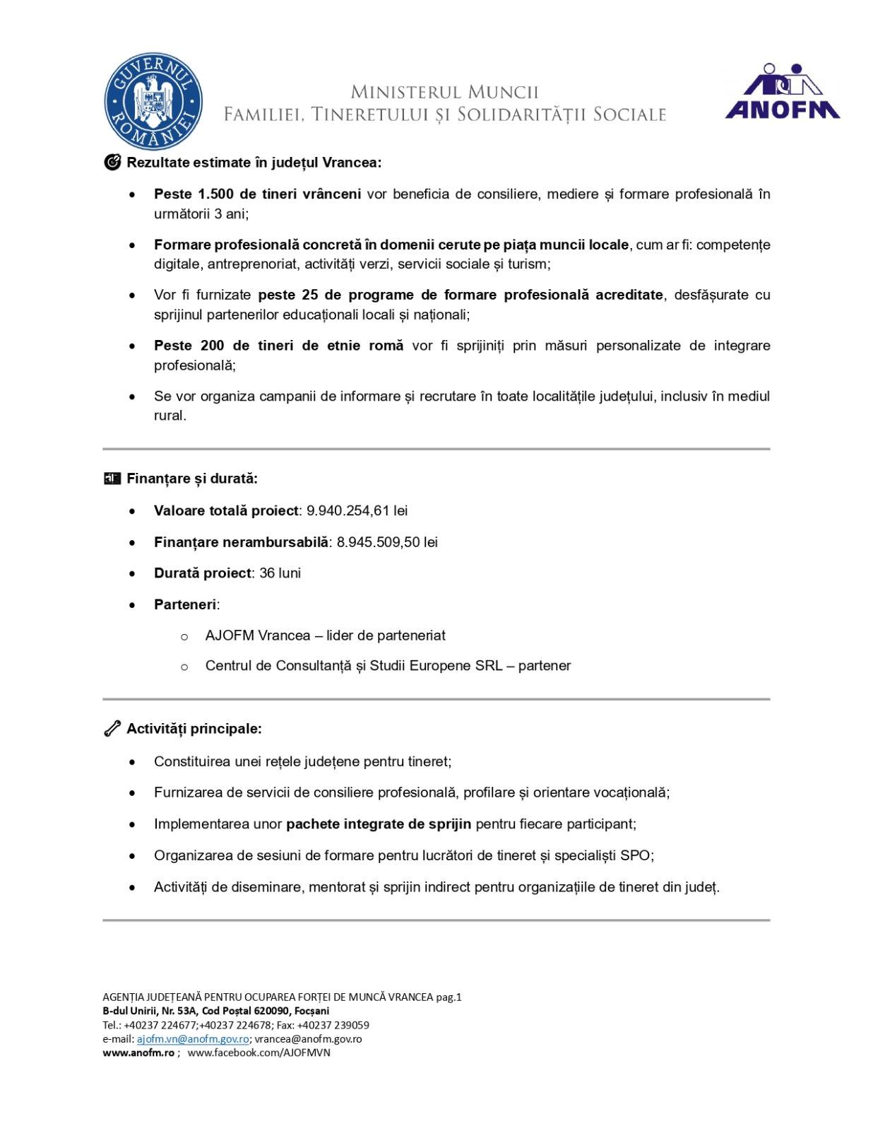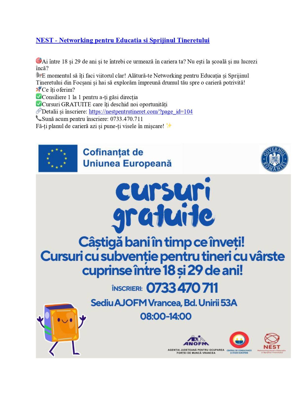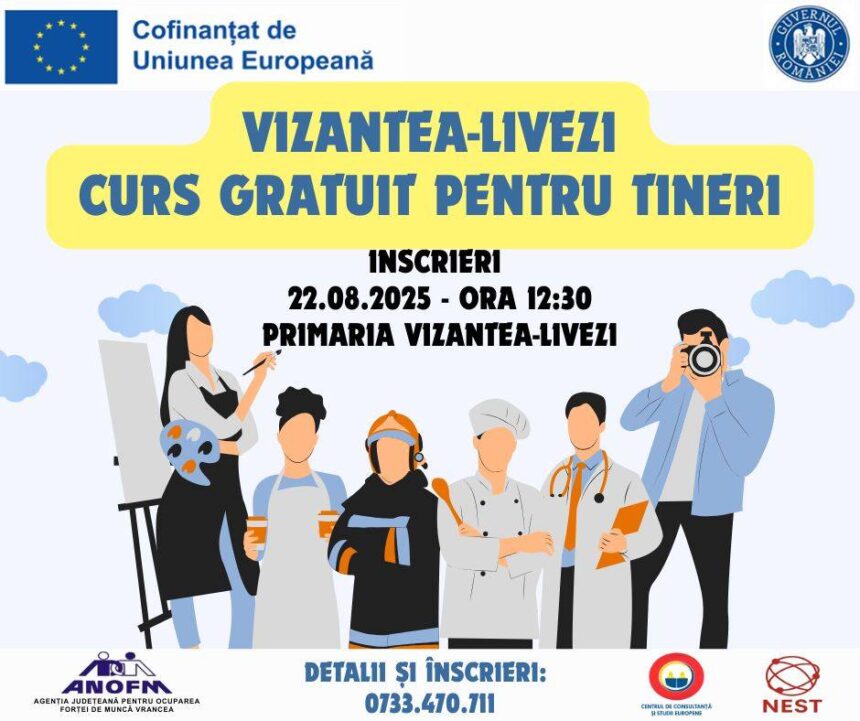 Dacă ai între 16 ani și 29 ani, ești persoană inactivă sau șomer, te așteptăm vineri, pe 22.08.2025, ora 12:30, cu cartea de identitate, diploma sau adeverință de studii, la sediul Primăriei Vizantea-Livezi, pentru a te înscrie la cursuri gratuite, de formare profesională, consiliere și sprijin educațional .