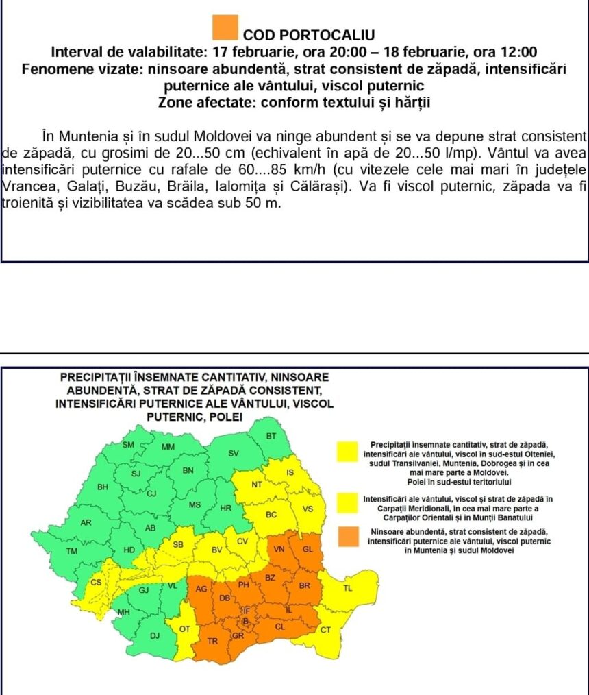 Administrația Națională de Meteorologie a emis mai multe avertizări de vreme severă valabile în intervalul 17 – 19 februarie 2026. Iată ce trebuie să știi: