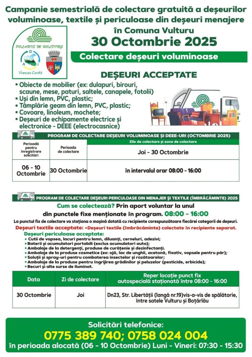 Primăria Comunei Vulturu, împreună cu Polaris M Holding și ADI Vrancea Curată, organizează campania semestrială de colectare gratuită a deșeurilor voluminoase, textile și periculoase din deșeuri menajere.