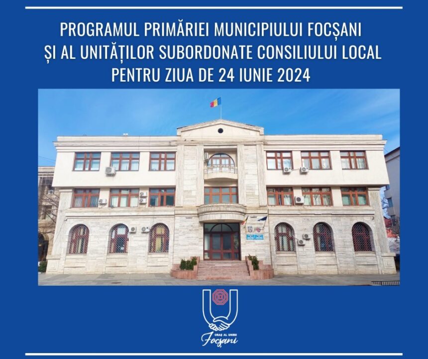 – Primăria Municipului Focșani: nu se lucrează. -️ Clubul Sportiv Municipal Focșani 2007: nu se lucrează. -️ Ateneul Popular “Maior Gh. Pastia” Focsani: nu se lucrează. -️ Ansamblul Folcloric ”Țara Vrancei”: nu se lucrează. -️ Teatrul Municipal “Maior Gh. Pastia” Focşani: nu se lucrează. – ️Serviciul Public Comunitar de Evidenţă a Persoanelor : Biroul evidența persoanelor: nu se lucrează. Biroul stare civilă: preluări și eliberări acte deces, în intervalul orar 9.00 – 13.00. -️ Serviciul Public Creşe: nu se lucrează, se asigură serviciul de continuitate. – ️Direcția de Asistență Socială Focşani: Program de lucru pentru relații cu publicul de la sediul instituției din strada Cuza-Vodă, nr. 34: nu se lucrează Pentru Centrul de Permanență Medicină de Familie – Dispensar Sud Focșani, situat în strada Revoluției nr. 12, Focșani, se va asigura serviciul de continuitate prin personalul de tură (telefon: 0727.391.371) – Direcţia de Dezvoltare Servicii Publice Focşani: Serviciul Spații Verzi: se asigură întreținerea spațiilor verzi din parcuri, Grădina Publică, Piața Unirii și intervenții în caz de urgență. Compartiment Administrare Cimitire și Prestări Funerare: personalul va fi solicitat în cazul în care vor apărea situații de urgență. – Poliția Locală a Municipiului Focșani: se asigură permanență și echipe de intervenție (telefoane: 0237.215.005, 0237.215.030). – ️S.C. Transport Public S.A. : Programul mijloacelor de circulație, ce efectuează transport public local de călători în Municipiul Focșani, Comuna Golești, Comuna Câmpineanca, Comuna Vârteșcoiu – sat Olteni, Comuna Milcovul, Comuna Gologanu, Comuna Răstoaca și Comuna Vânători, pentru luni, 24 iunie 2024, va fi cel utilizat în zilele de weekkend. -️S.C. ENET S.A. Focșani – Serviciul Comercial casierie (str. Cuza Vodă nr.3): nu se lucrează. S.C. ENET S.A. Focșani pentru DISPECERAT U.D.E.T. – telefon 0237/233.555 și MAIȘTRI DE EXPLOATARE – telefon 0237/212.400. – ️S.C. Administrația Piețelor Focșani S.A.: program normal de lucru în ceea ce privește funcționarea piețelor din Municipiul Focșani. – ️S.C. Compania de Utilităţi Publice S.A. Focşani: se asigură serviciul de permanență și asistență tehnică, prin personalul de tură și dispecerat. – ️Salubrizare și Servicii Publice Focșani SA: program sediul central și casieria din strada Simion Bărnuțiu nr. 2: nu se lucrează. Salubritate menajeră: program normal (07.00 – 21.00) Salubritate stradală: program de duminică. Dispeceratul Salubrizare și Servicii Publice Focșani SA va avea program normal de lucru (24/24, 7/7). -️ Compartiment de protecție civilă, situații de urgență: Personalul va fi solicitat în cazul în care vor apărea situații de urgență.