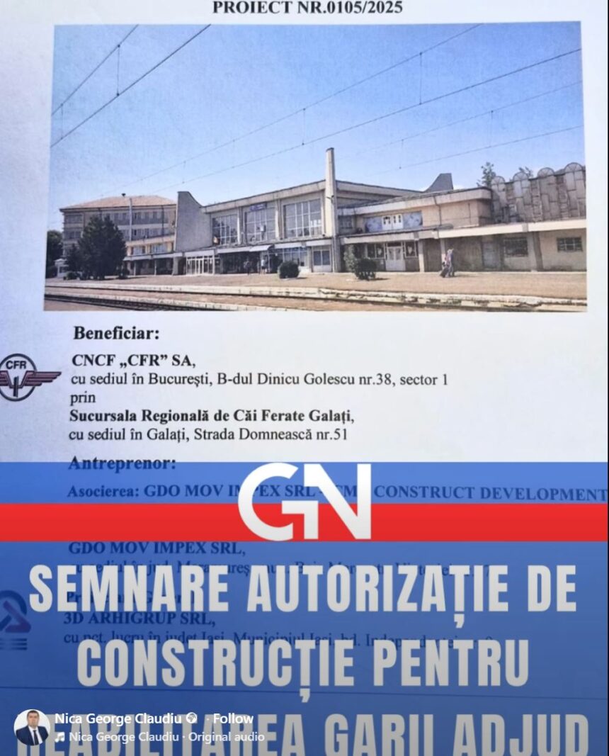 Nica George Claudiu: Astăzi am semnat autorizația de construire pentru reabilitarea și modernizarea Gării Adjud – un proiect de investiții implementat de Compania Națională CFR Infrastructură, aflată în subordinea Ministerului Transporturilor și Infrastructurii, cu o valoare de aproximativ 12,8 milioane de lei, care va transforma acest obiectiv strategic într-un spațiu modern, sigur și eficient energetic. Lucrările de reabilitare și modernizare completă a Gării Adjud, mult așteptate de noi – adjudenii, vor schimba imaginea orașului pentru cei aflați în tranzit și o vor transforma într-o „poartă” modernă de intrare în Adjud pentru vizitatori. Proiectul se va desfășura pe o suprafață totală de 2.230 m². Consider că este încă o cărămidă importantă pusă la dezvoltarea Adjudului, de aceea administrația locală va susține proiectul prin toate demersurile necesare, astfel încât lucrările să se desfășoare în bune condiții. Modernizarea Gării Adjud nu este doar o investiție în infrastructură, ci un simbol al direcției în care comunitatea adjudeană își construiește viitorul.
