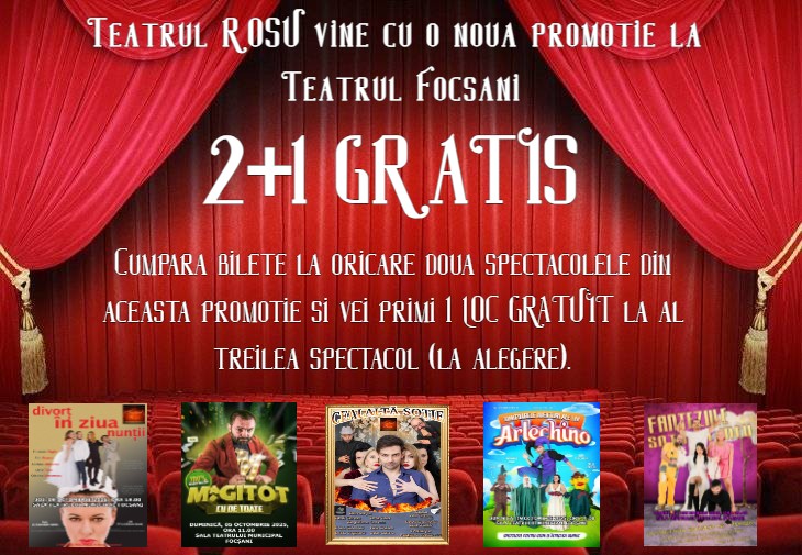 𝟐+𝟏 𝐆𝐑𝐀𝐓𝐈𝐒 Cumpără bilete la oricare doua spectacolele din această promoție si vei primi 𝟏 𝐥𝐨𝐜 𝐆𝐑𝐀𝐓𝐔𝐈𝐓 la al treilea spectacol (la alegere). Spectacolele care intră la promotie: