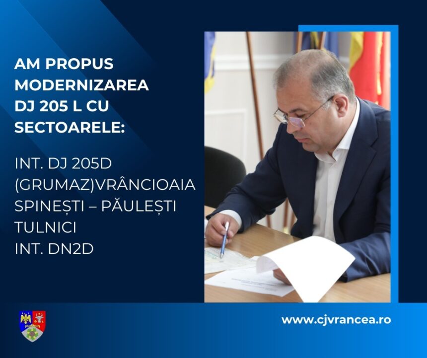 Am propus consilierilor județeni și cu unanimitate am aprobat Nota Conceptuală și Tema de Proiectare pentru modernizarea drumului județean 205L, pe sectoarele: – int. DJ 205D (Grumaz) – Vrâncioaia – Spinești – Păulești – Tulnici – int. DN2D Starea actuală a drumului afectează siguranța și dezvoltarea acestor comunități, de aceea această investiție este una urgentă și necesară. Prin modernizare, locuitorii și cei care vor tranzita aceste zone, vor beneficia de: