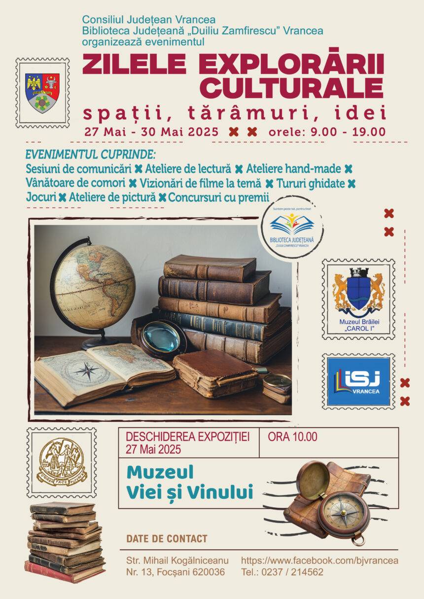 Biblioteca Județeană Duiliu Zamfirescu Vrancea are bucuria de a anunța organizarea evenimentului ZILELE EXPLORĂRII CULTURALE. Spații. Tărâmuri. Idei, o manifestare dedicată publicului pasionat de cultură, geografie și călătorie, desfășurată în perioada 27 Mai – 6 Iunie 2025, putând fi vizitată în intervalul orar 9.00 – 19.00, la Muzeul Viei și Vinului din Focșani (Str. Cuza Vodă, Nr. 8). Evenimentul propune o incursiune inedită între nostalgie, curiozitate și joc, aducând în prim-plan expoziții tematice, comunicări științifice și activități interactive.
