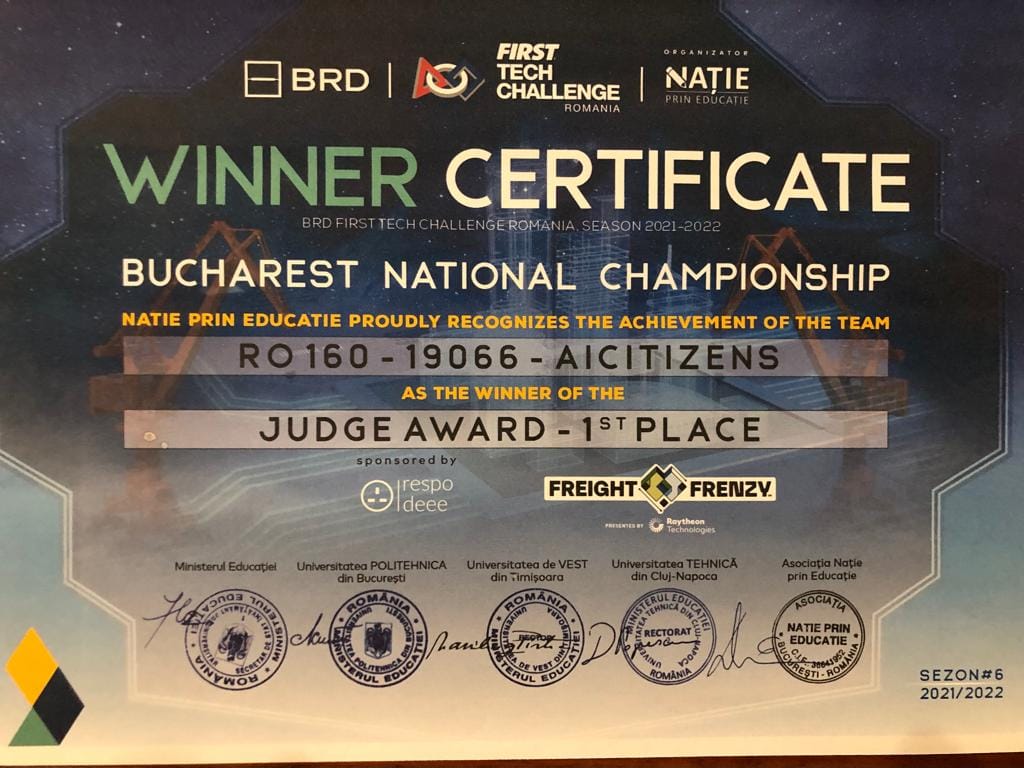Avem vesti minunate! Premiul I la Judge Award câștigat de AICitizens, echipa de robotică a CNAIC sub coordonarea profesorilor Tiberiu și Mihaela Oprea! Echipa de la Cuza aduce un premiu I in Vrancea de la Campionatul Național de robotică FIRST Tech Chalenge Romania ediția #6 2021/2022! Felicitări echipei de copii implicați si mentorilor lor pasionați! Un mare bravo pentru munca voastră! Multumim!